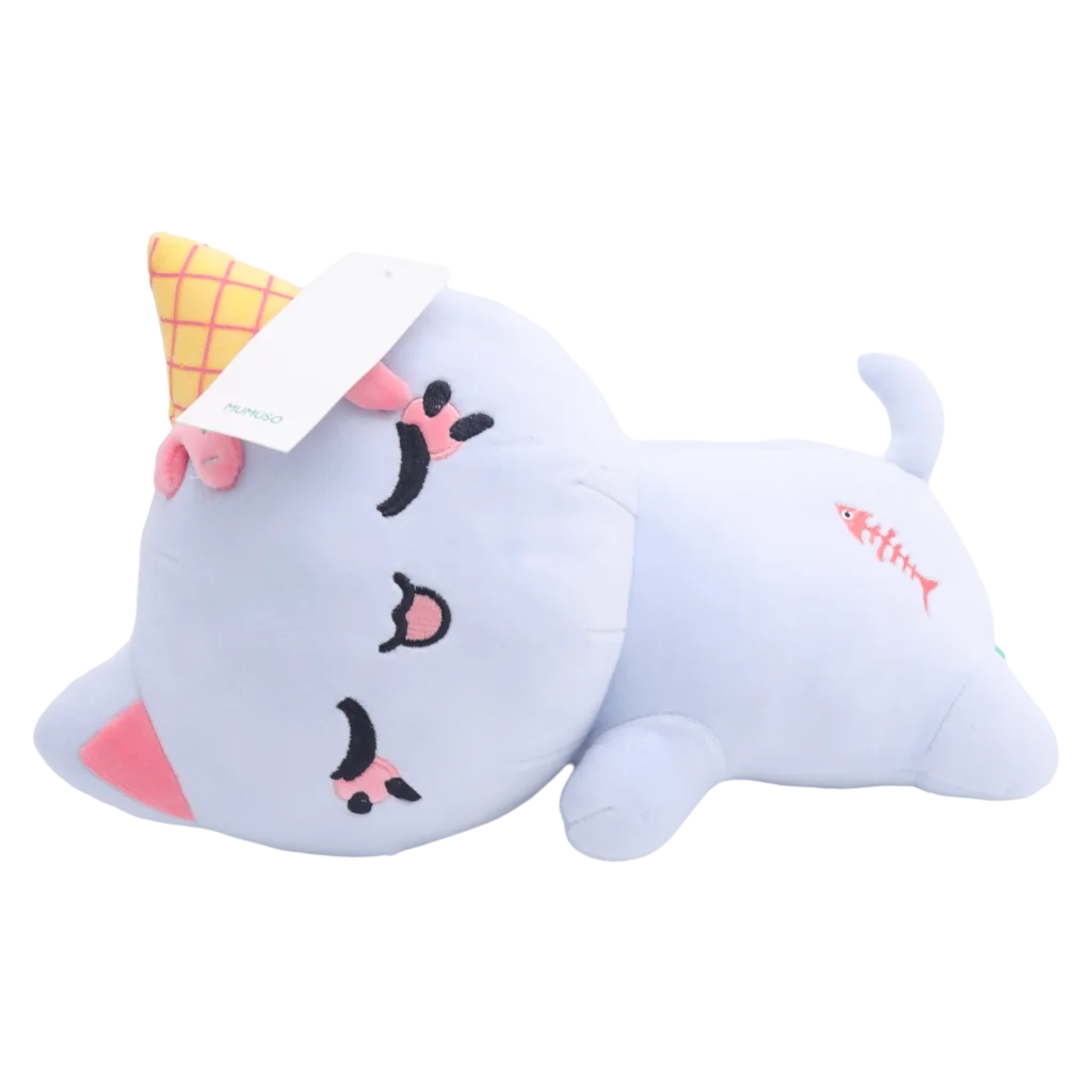 Das Plüschtier präsentiert sich in einem hellblauen Farbton mit charmanten Details wie aufgestickten Augen, Fischgräten-Print und einem dekorativen Eiswaffel-Horn. Die weiche Plüschoberfläche fühlt sich angenehm auf der Haut an und eignet sich auch für empfindliche Kinderhände.