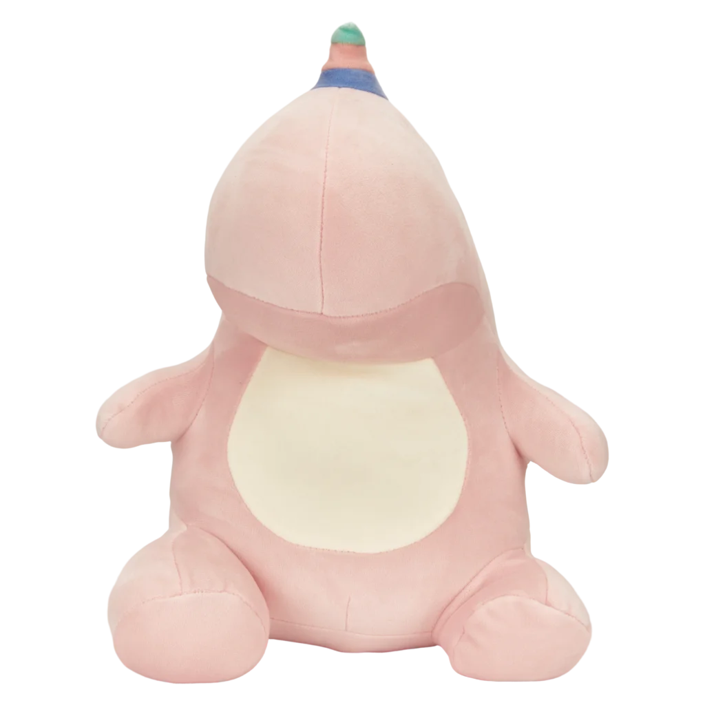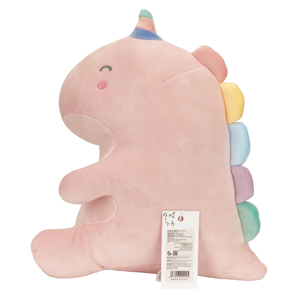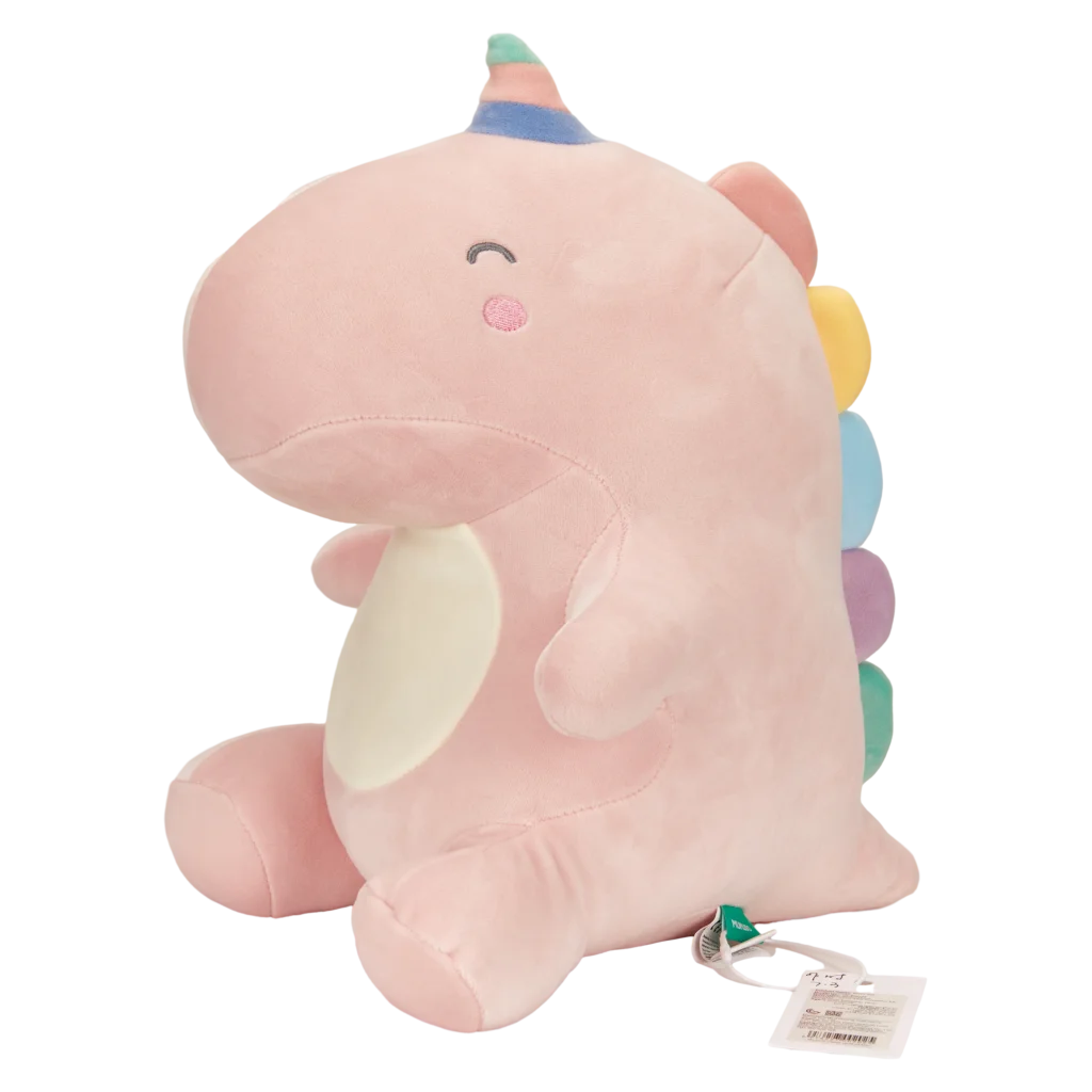 Das Plüschtier besteht aus einem Obermaterial aus 95% Polyester und 5% Elasthan (außer bei Dekorteilen) sowie einer weichen Füllung aus 100% Polyester. Das rosa Grunddesign wird durch bunte Details am Rücken und ein pastellfarbenes Horn ergänzt.