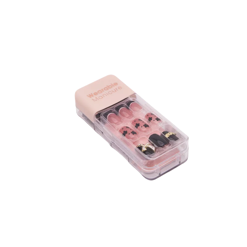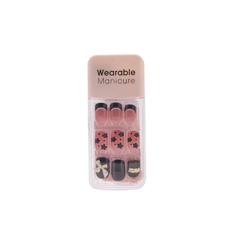 Gefertigt aus hochwertigem ABS, überzeugt das Set mit einem eleganten Mix aus Rosa und Schwarz sowie floralen Prints. Einzelne Nägel sind mit Schleifen- und Ketten-Elementen verziert, was dem Design einen verspielten und zugleich stilvollen Touch verleiht. Die Form passt sich optimal an den Naturnagel an.