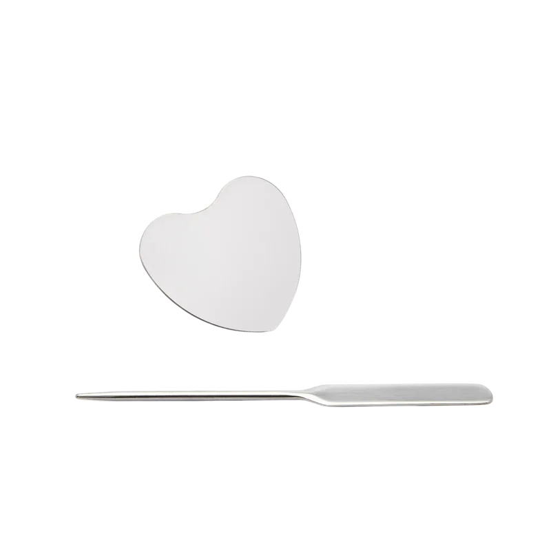 Die Herzform der Mischpalette bringt einen stilvollen Akzent auf jeden Schminktisch, während die Fertigung aus hochwertigem Edelstahl für Langlebigkeit und eine einfache Reinigung sorgt. Der beiliegende Spatel unterstützt präzises, hygienisches Arbeiten.
