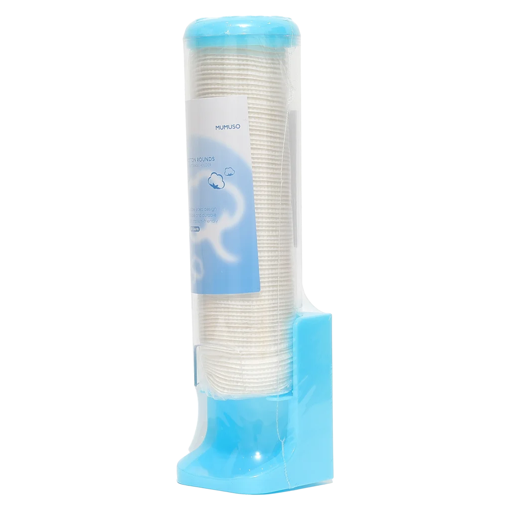 Die weißen Wattepads werden in einem transparenten Spender mit blauem Standfuß geliefert. Das durchdachte Design sorgt für eine kontrollierte Entnahme und schützt vor Verunreinigung. Der Halter ist platzsparend und fügt sich dezent ins Bad ein.