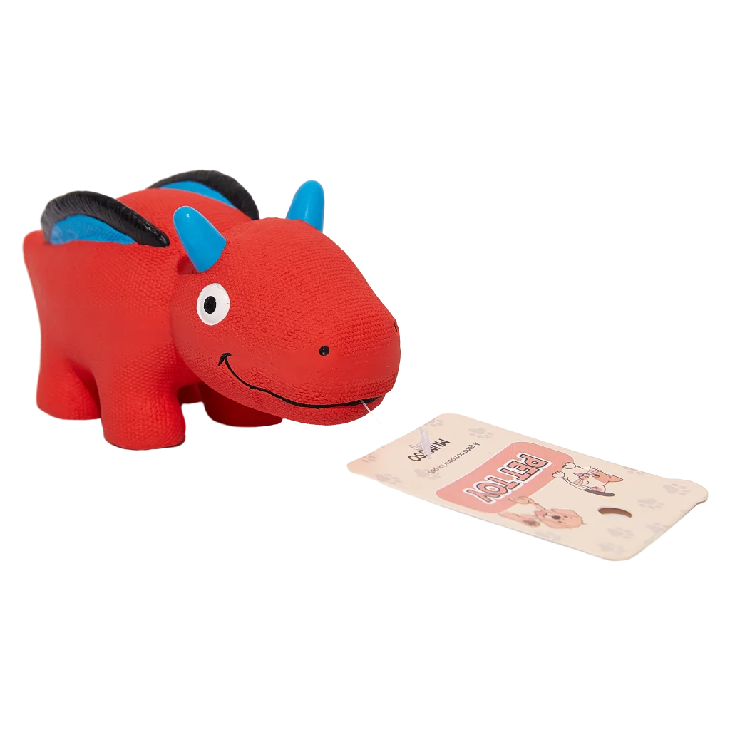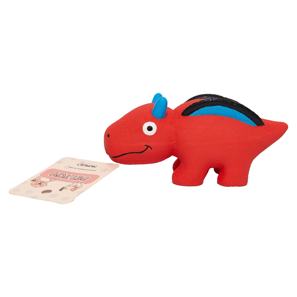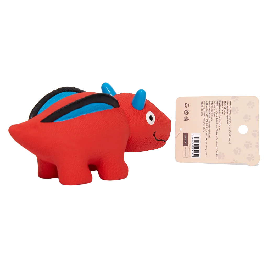 Das Hundespielzeug besticht mit einem freundlichen Dinosaurier-Design in auffälligem Rot mit blauen und schwarzen Farbakzenten. Die strukturierte Oberfläche animiert zum Kauen und Spielen – durch die kompakte, robuste Form liegt es gut im Maul.