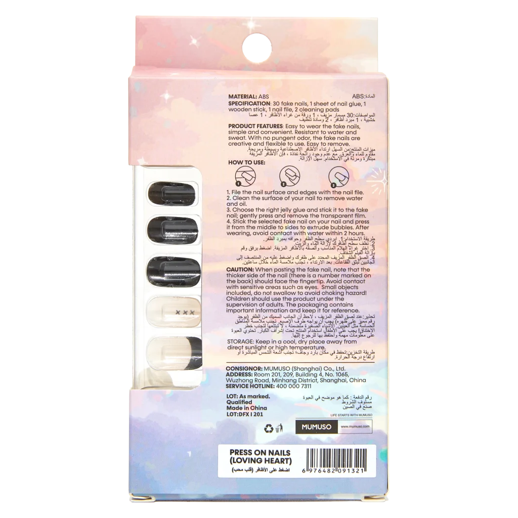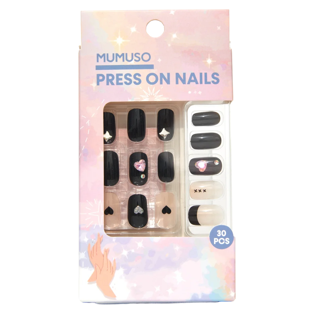 Das Set enthält 30 selbstklebende Nägel in elegantem Schwarz mit detailreichen Herz- und Stern-Designs. Die flexible Passform macht die Anwendung angenehm und individuell – für jeden Nageltyp geeignet.