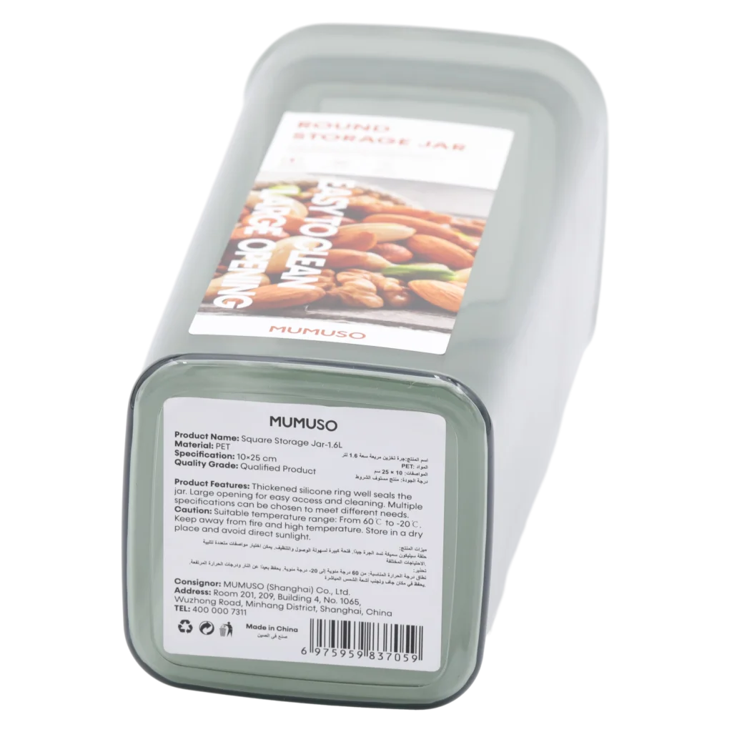 Dieses quadratische Vorratsglas mit einem Fassungsvermögen von 1600 ml bietet ausreichend Platz zur Aufbewahrung von trockenen Lebensmitteln wie Pasta, Müsli oder Trockenfrüchten. Ob für Familien oder Einzelhaushalte – es ist ein vielseitiger Alltagshelfer in jeder Küche.