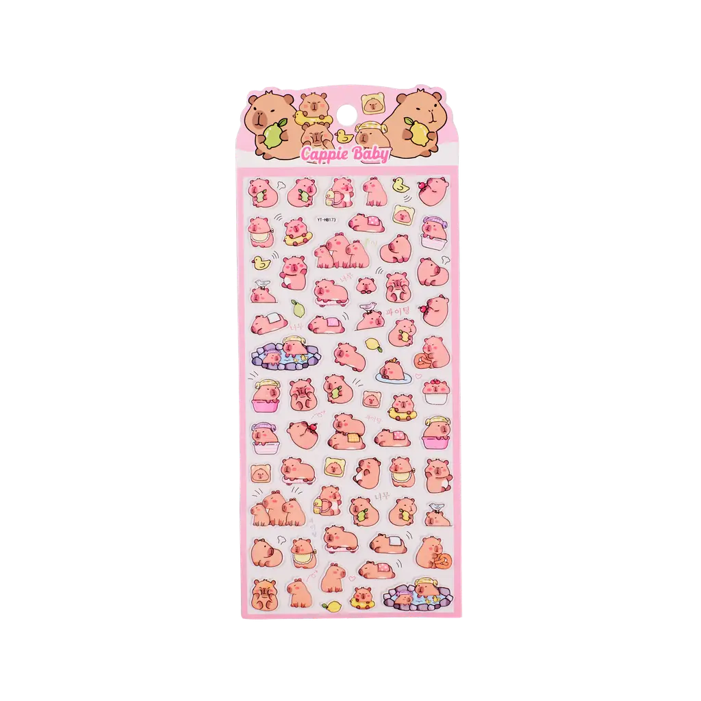 Jeder Stickerbogen zeigt liebevoll gestaltete Capybaras in verschiedenen Posen. Die Sticker sind leicht erhaben, was dem Design eine besondere Haptik verleiht. Die Farbtöne reichen von Rosa bis Beige und erzeugen ein freundliches Gesamtbild (Mehrfarbig).