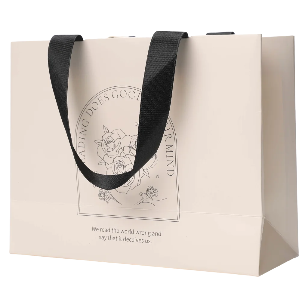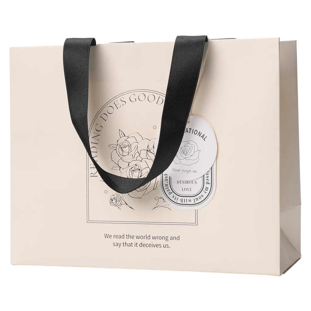 Die Tasche präsentiert sich in einem edlen Beige mit feinem Blumen-Print auf der Vorderseite. Die schwarzen Henkel sorgen für einen angenehmen Tragekomfort und ergänzen das dezente Design optimal. Das Format bietet Platz für kleinere bis mittlere Geschenke.