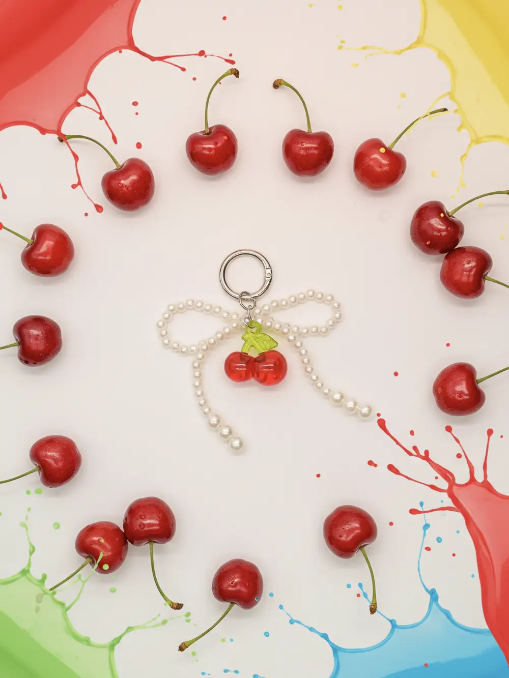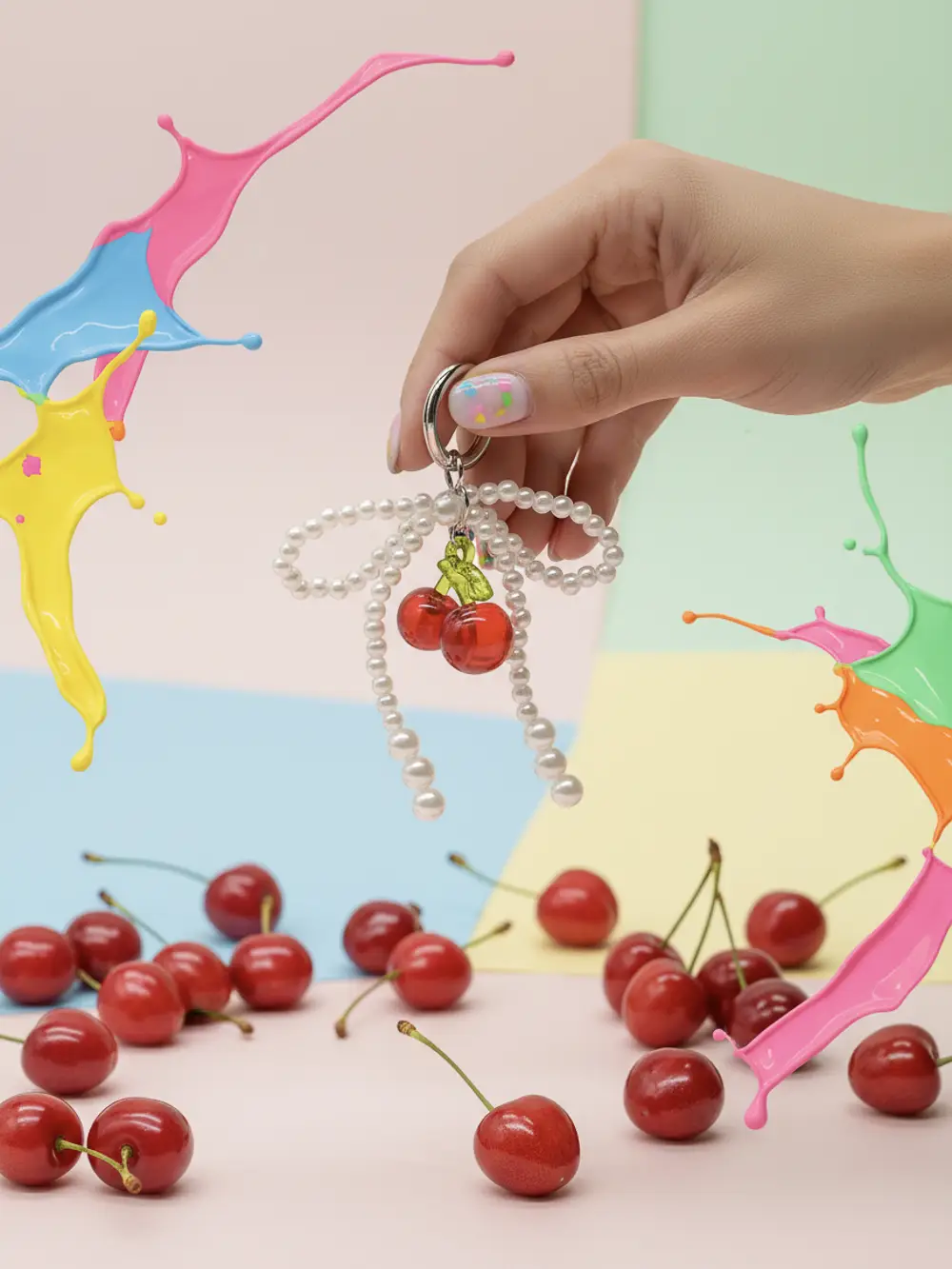 - Schlüsselanhänger mit Kirschen-Design und Perlenkette (Rot/Grün)