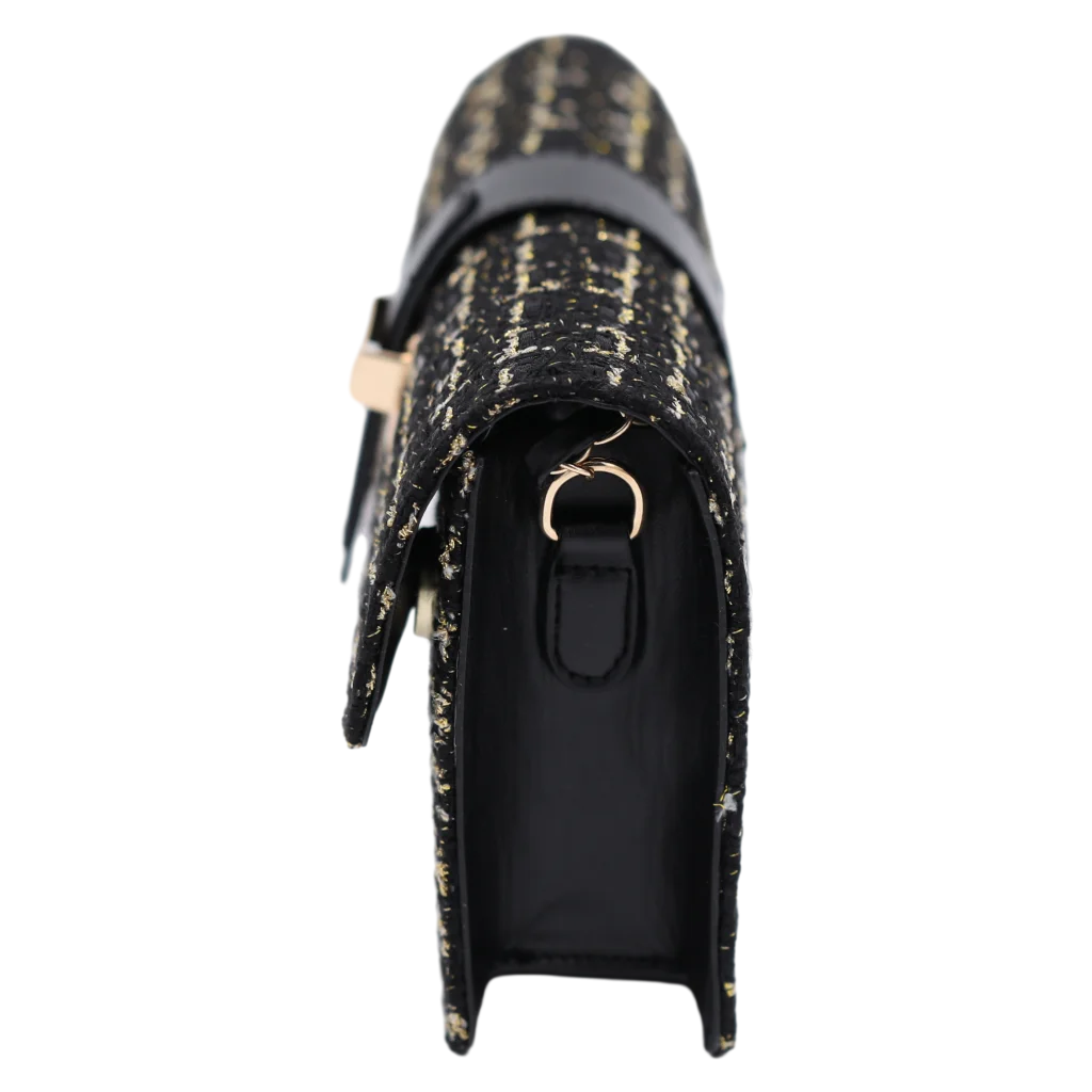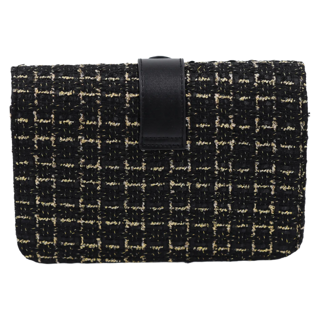 Der strukturierte schwarze Stoff und das markante Muster machen die Tasche zu einem Blickfang. Der breite Riemen mit goldfarbenem Verschluss und die Metallkette setzen stilvolle Akzente. Das klassische Schwarz lässt sich vielseitig kombinieren.