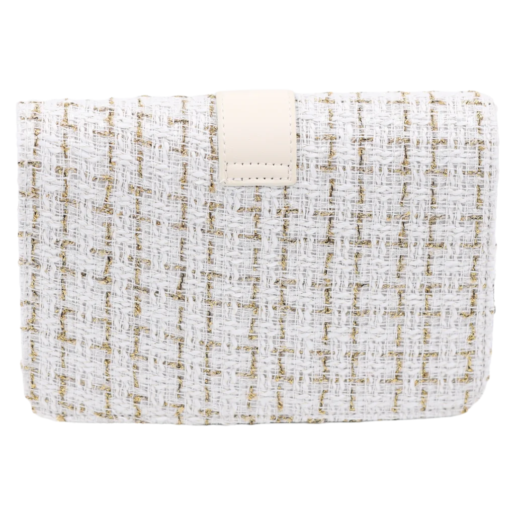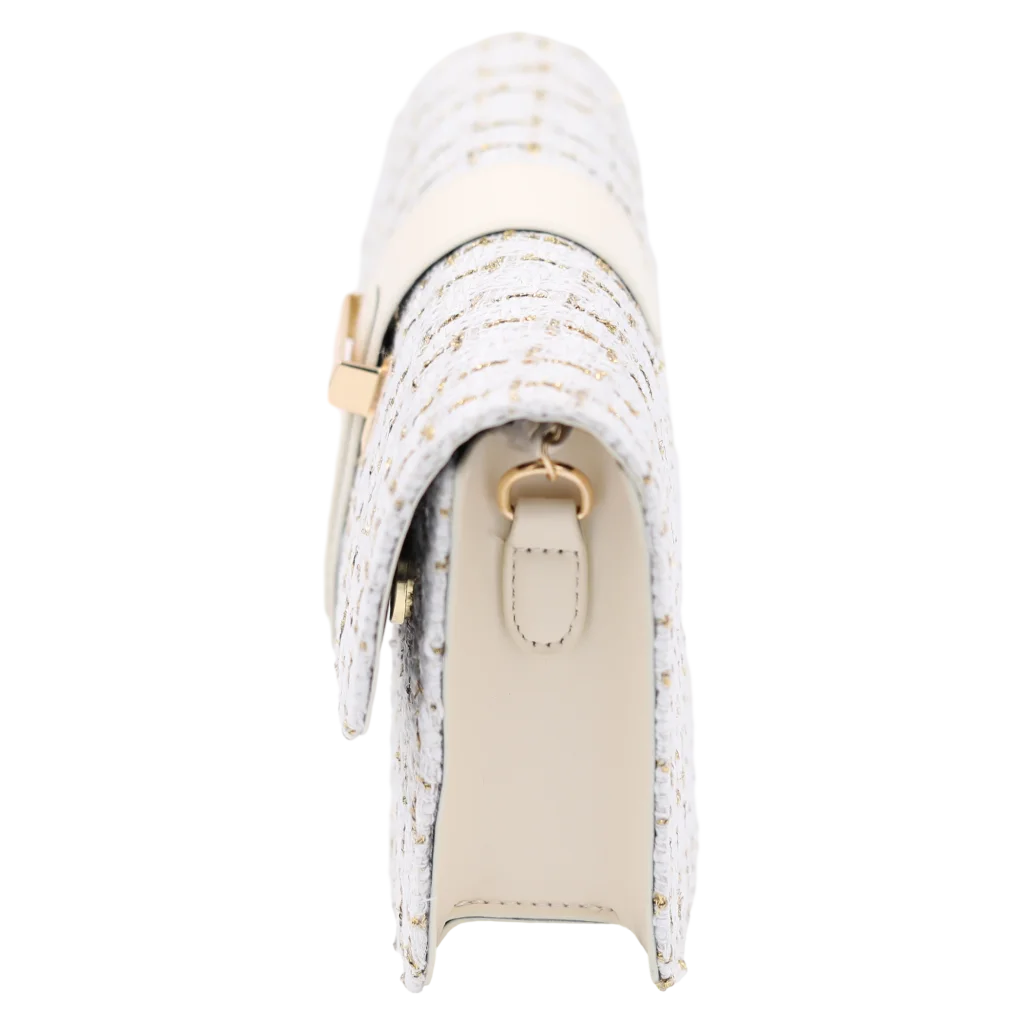 Die Tasche besticht mit einer strukturierten Oberfläche und dezentem Karo-Print in verschiedenen Farbtönen auf beigem Grund. Der Kettenriemen sorgt für einen eleganten Kontrast und lässt sich angenehm über der Schulter tragen. Mit metallischem Verschluss wirkt das Design hochwertig und modisch zugleich.