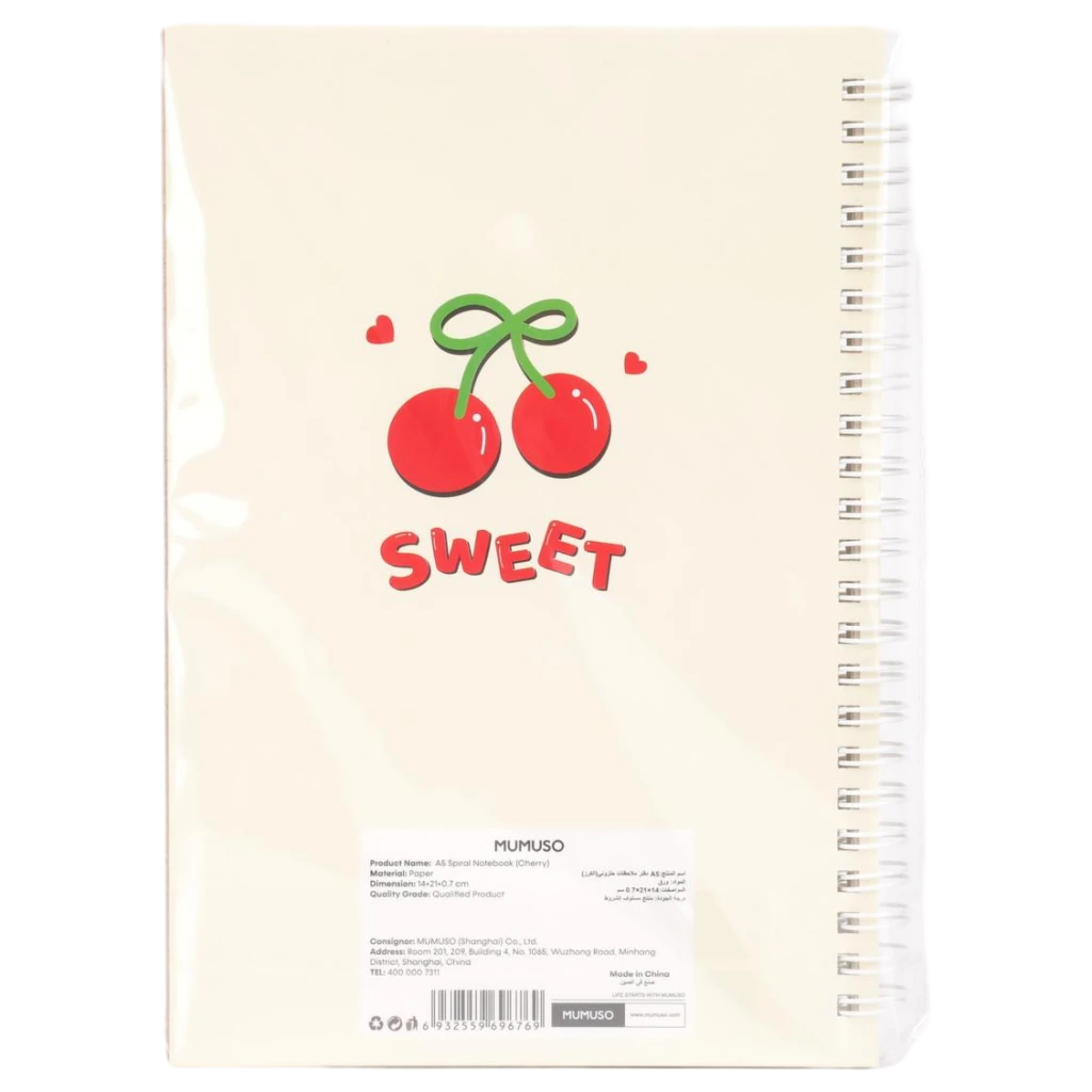 Das Notizbuch überzeugt durch ein verspieltes Kirsch-Design auf cremefarbenem Cover. Die stabile Spiralbindung sorgt für einfaches Umblättern und ein angenehmes Schreibgefühl.
