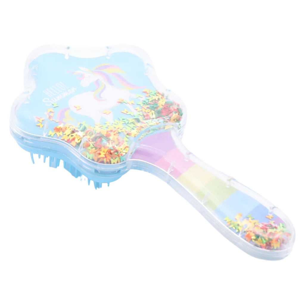 Gefertigt aus langlebigem Polystyrol mit weichen TPR- und Nylonelementen, vereint die Bürste Stabilität und Flexibilität für schmerzfreies Kämmen. Das transparente Gehäuse mit farbigem Einhorn-Print und glitzernden Elementen macht sie zu einem besonderen Hingucker im Badezimmer.