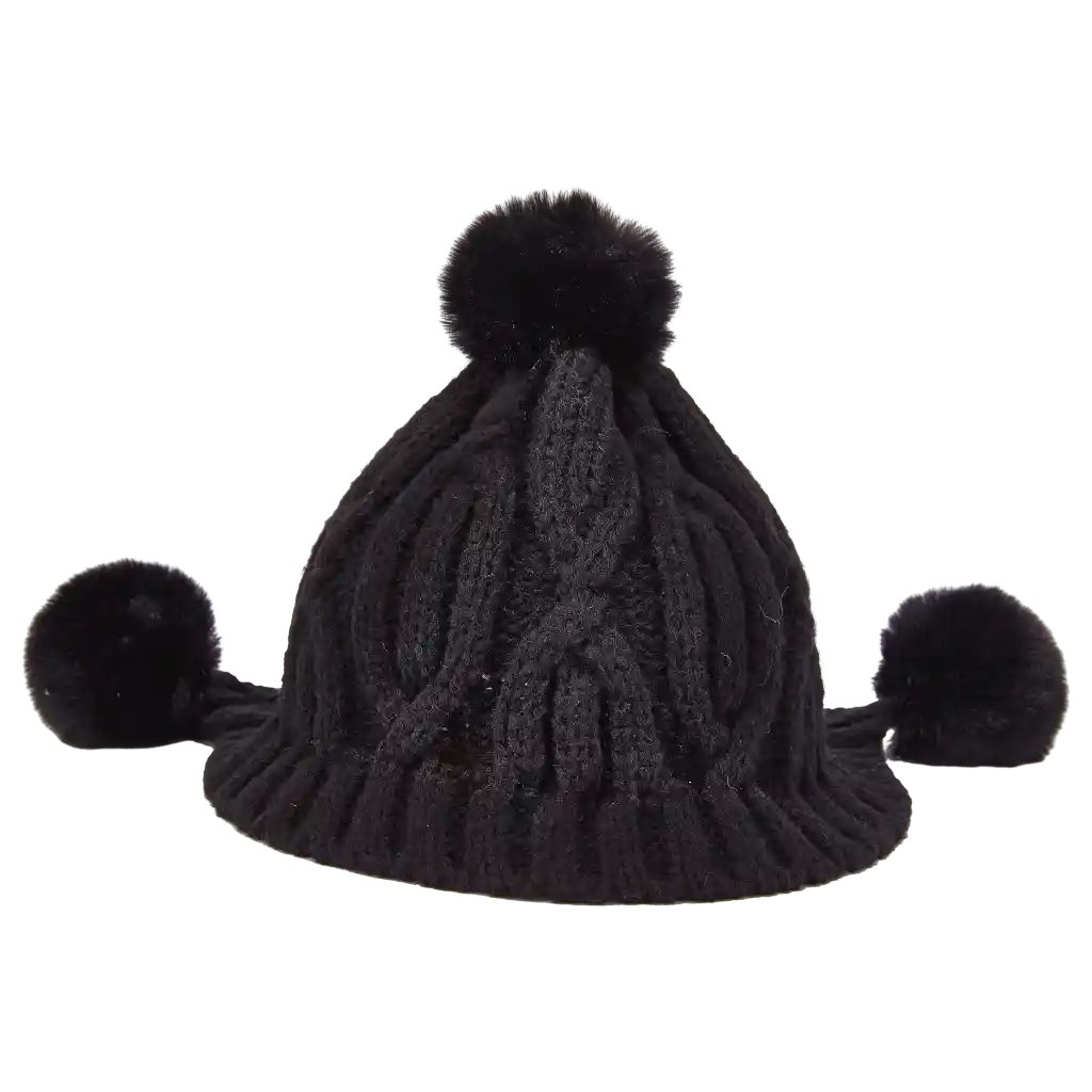 Die Mütze präsentiert sich in elegantem Schwarz mit geflochtenem Strickmuster und drei passenden Bommeln. Das weiche, kuschelige Material hält Kopf und Ohren zuverlässig warm. Die sorgfältige Verarbeitung sorgt für eine angenehme Haptik und optimalen Tragekomfort.