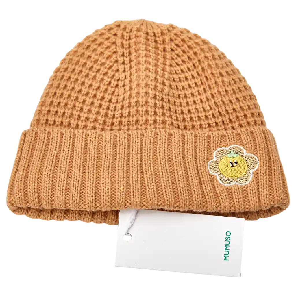 Die Mütze präsentiert sich in modernem Khaki und ist auf der Vorderseite mit einem fröhlichen Blumen-Design versehen. Das grob gestrickte Material sorgt für angenehme Wärme und passt sich flexibel an verschiedene Kopfformen an.