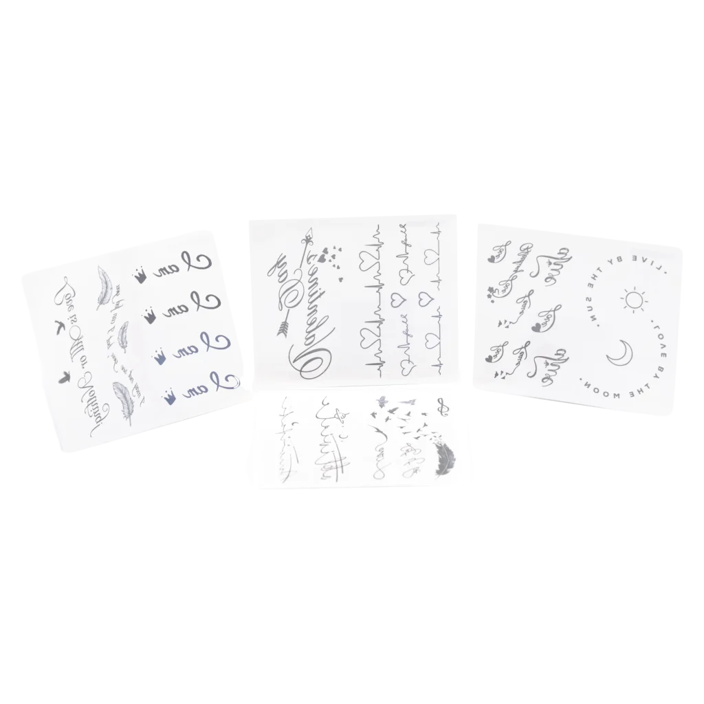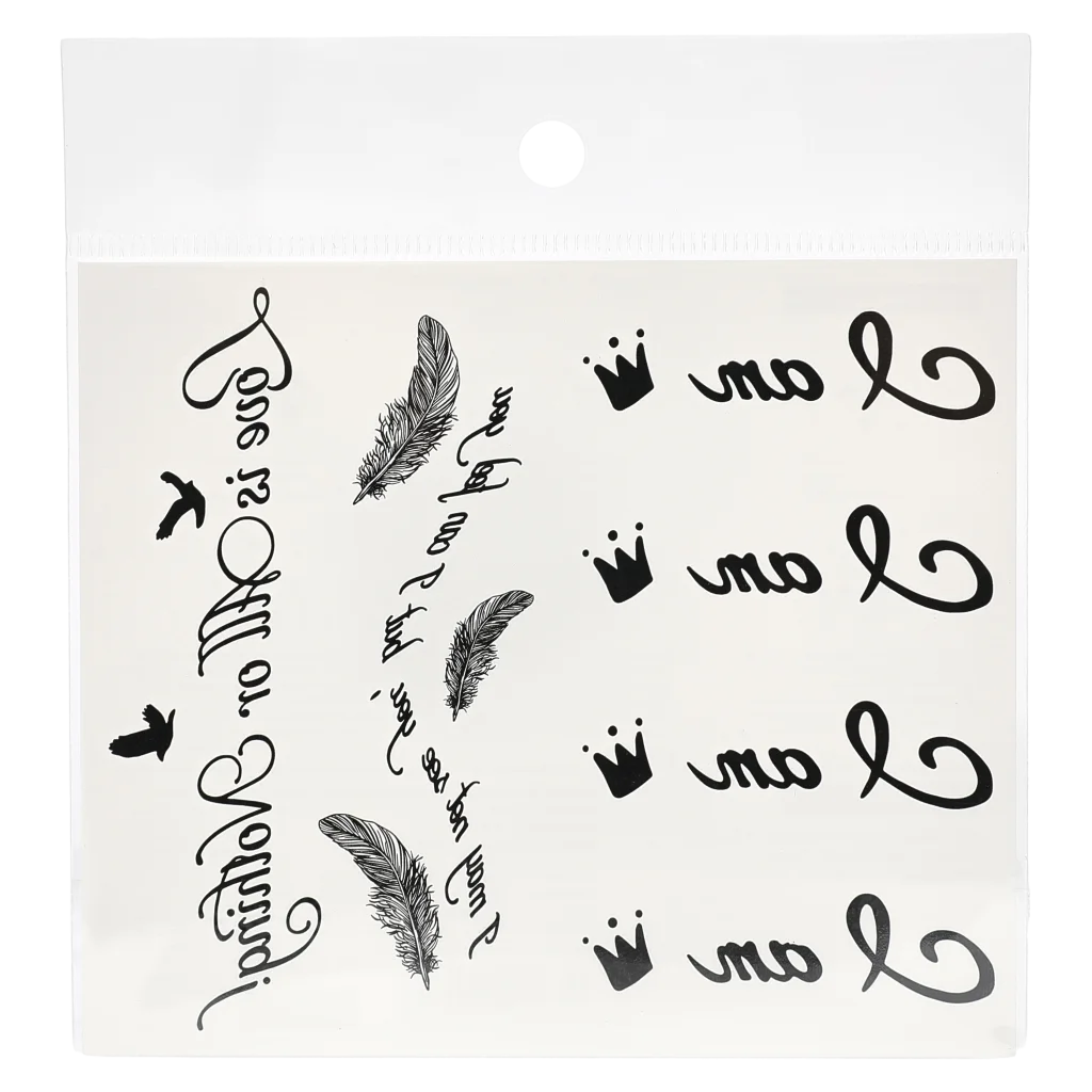 Die Tattoos überraschen durch verschiedene Schriftzug- und Symbol-Prints wie Herzen, Kronen oder Mondmotive. Das Design setzt auf feine Linien und elegante Formen, die zu jedem Stil passen. Die Sticker sind meist in schlichtem Schwarz-Weiß gehalten, wodurch sie vielseitig kombinierbar sind.