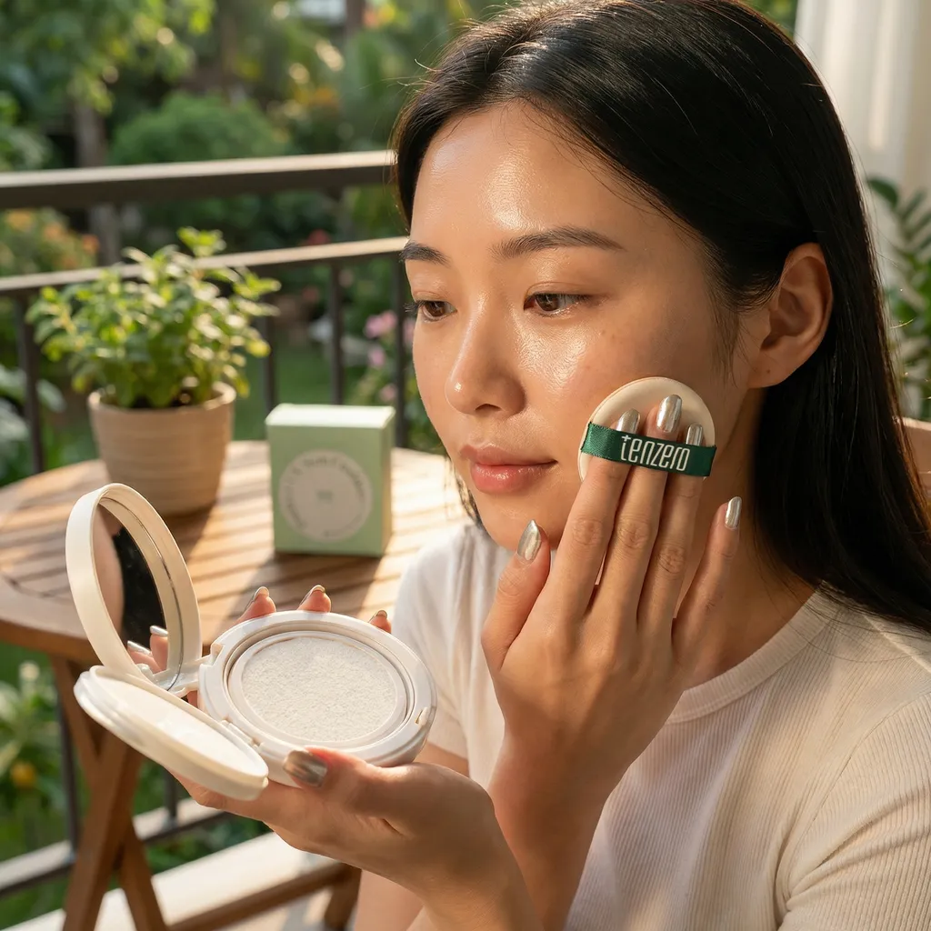 Tragen Sie den TENZERO Perfect UV Sun Cushion gleichmäßig auf das Gesicht auf, um optimalen Schutz zu gewährleisten. Ideal für die Anwendung vor dem Make-up oder als Auffrischung während des Tages.