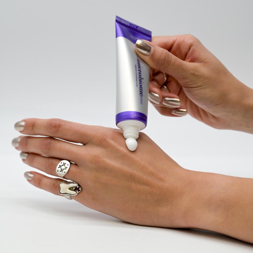 Die Creme hat eine leichte, aber reichhaltige Textur, die schnell einzieht und ein angenehmes Hautgefühl hinterlässt. Sie ist mit einem speziellen Mikrobiom-Komplex formuliert, der die Hautflora unterstützt und die Hautgesundheit fördert.