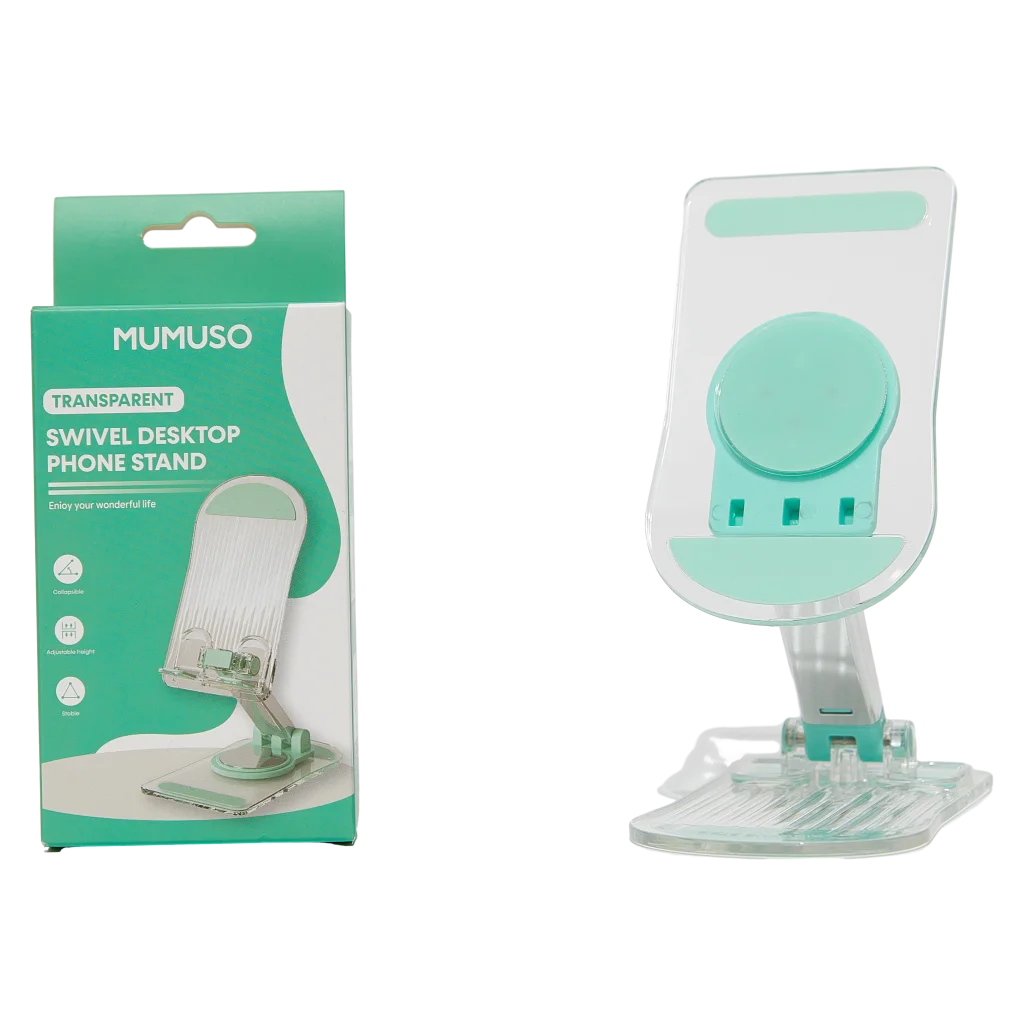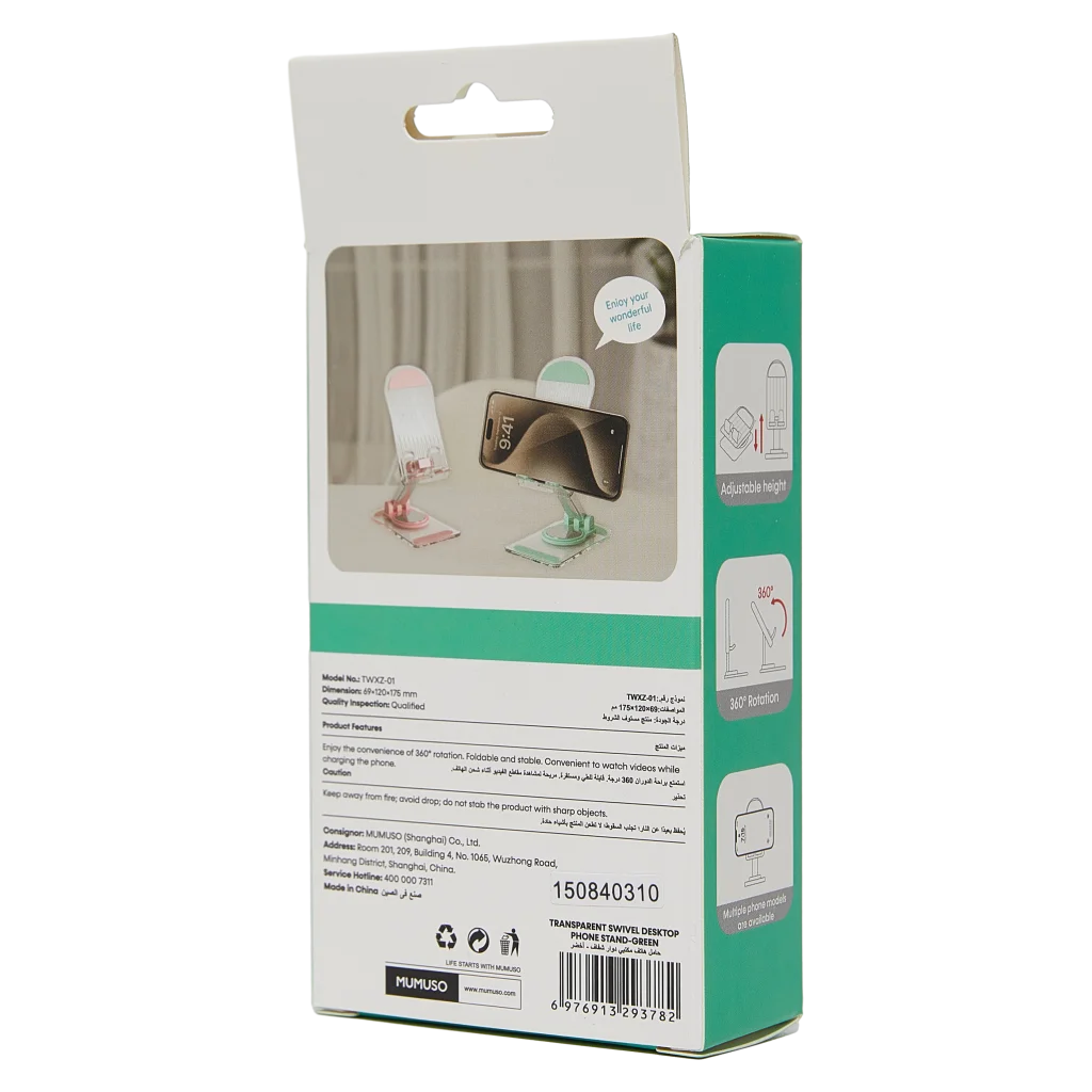 Gefertigt aus robustem, transparentem Kunststoff mit Akzenten in Grün, überzeugt die Handyhalterung mit einem modernen Look, der sich dezent in jede Umgebung einfügt. Die Drehfunktion ermöglicht verschiedene Blickwinkel und einen anpassbaren Stand.