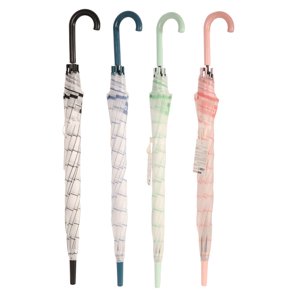 Der Regenschirm aus Fiberglas und Stahlgestell bietet zuverlässigen Schutz bei nassem Wetter. Transparentes Material mit Raster-Design bringt Leichtigkeit in den Alltag. Drei Farbvarianten (Dunkelblau/Mint/Pink) stehen zur Auswahl und richten sich an alle, die einen funktionalen, modernen Schirm suchen.