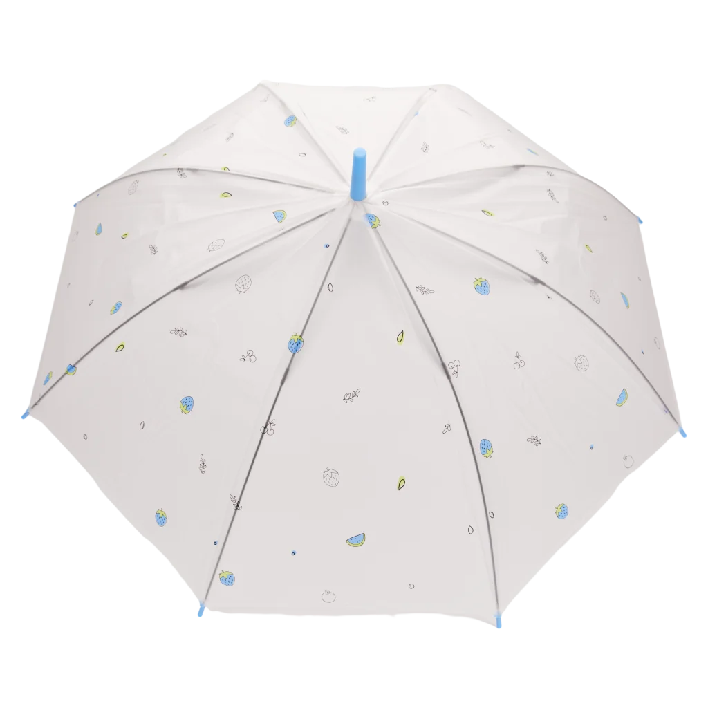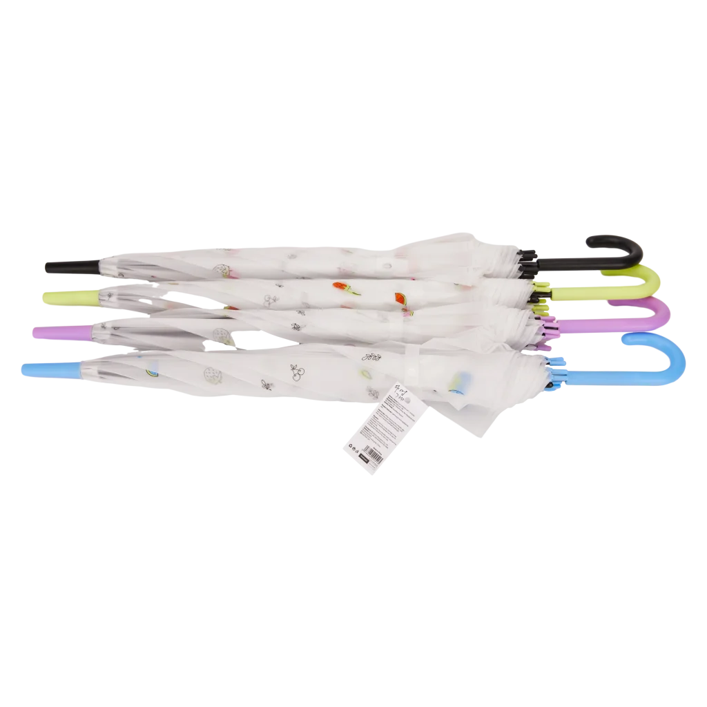 Der transparente Regenschirm mit Frucht-Print ist ideal für Kinder und Erwachsene, die bei Regenwetter trocken bleiben möchten. Das stabile Gestell aus Glasfaser-Eisen und der J-Griff aus PP sorgen für angenehme Handhabung. In vier Varianten mit bunten Griffen (Blau/Gelb/Lila/Schwarz) erhältlich.