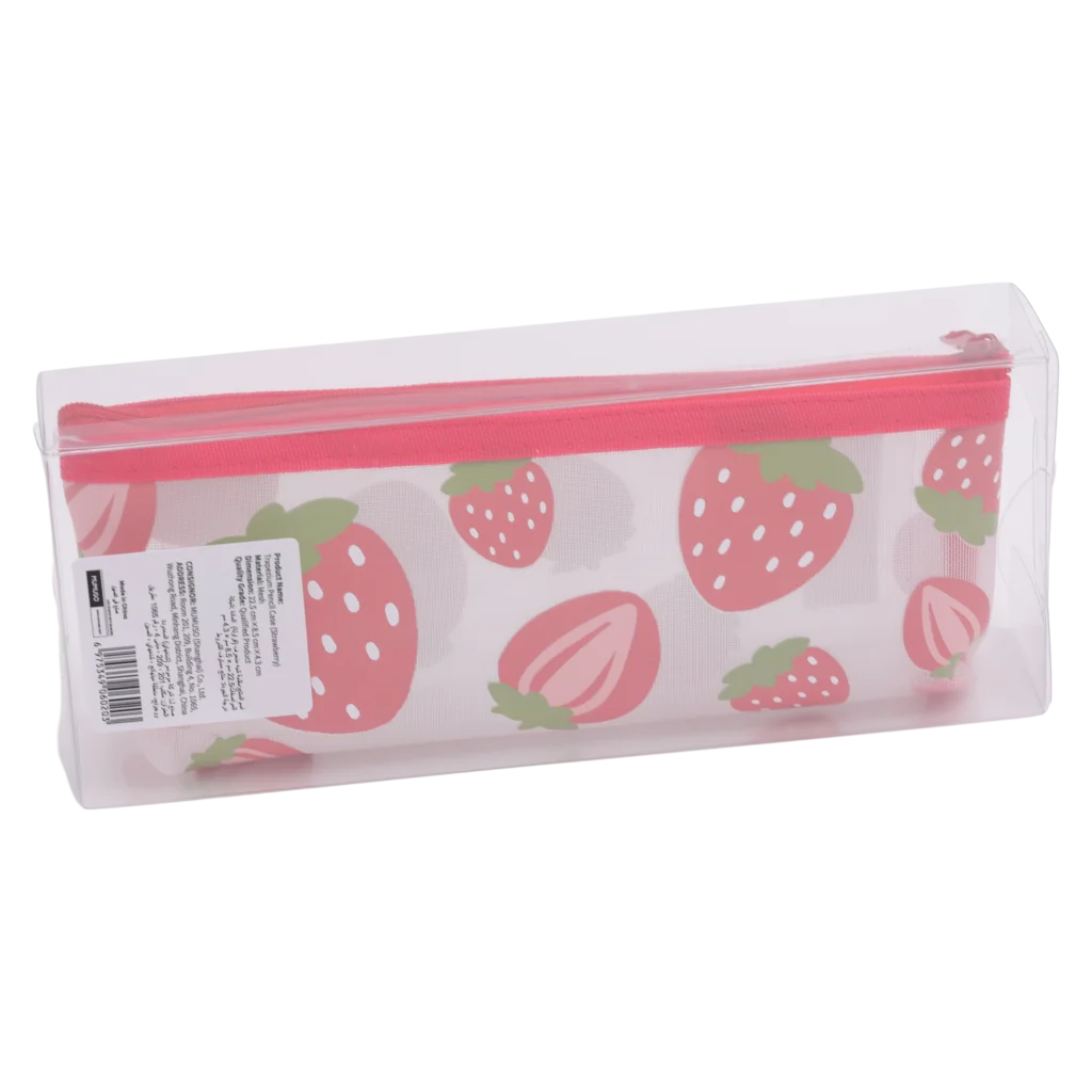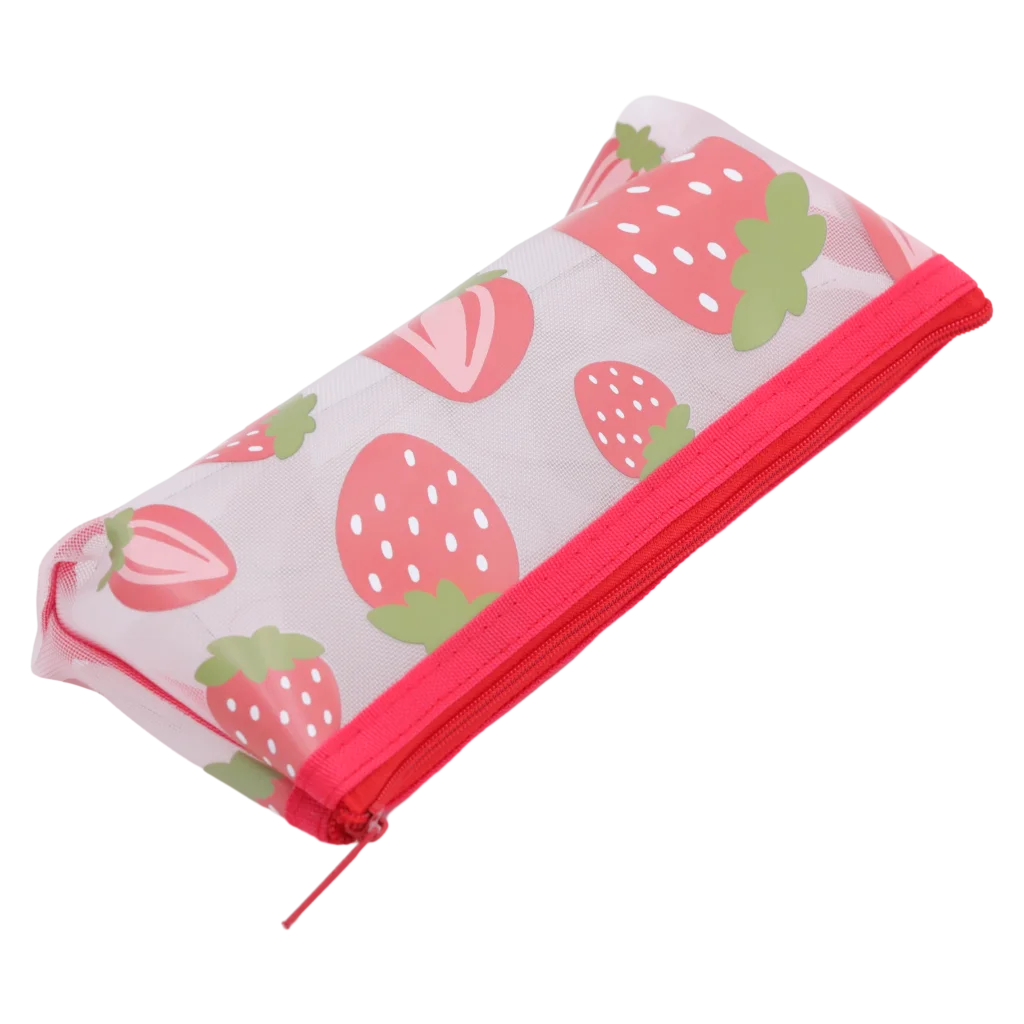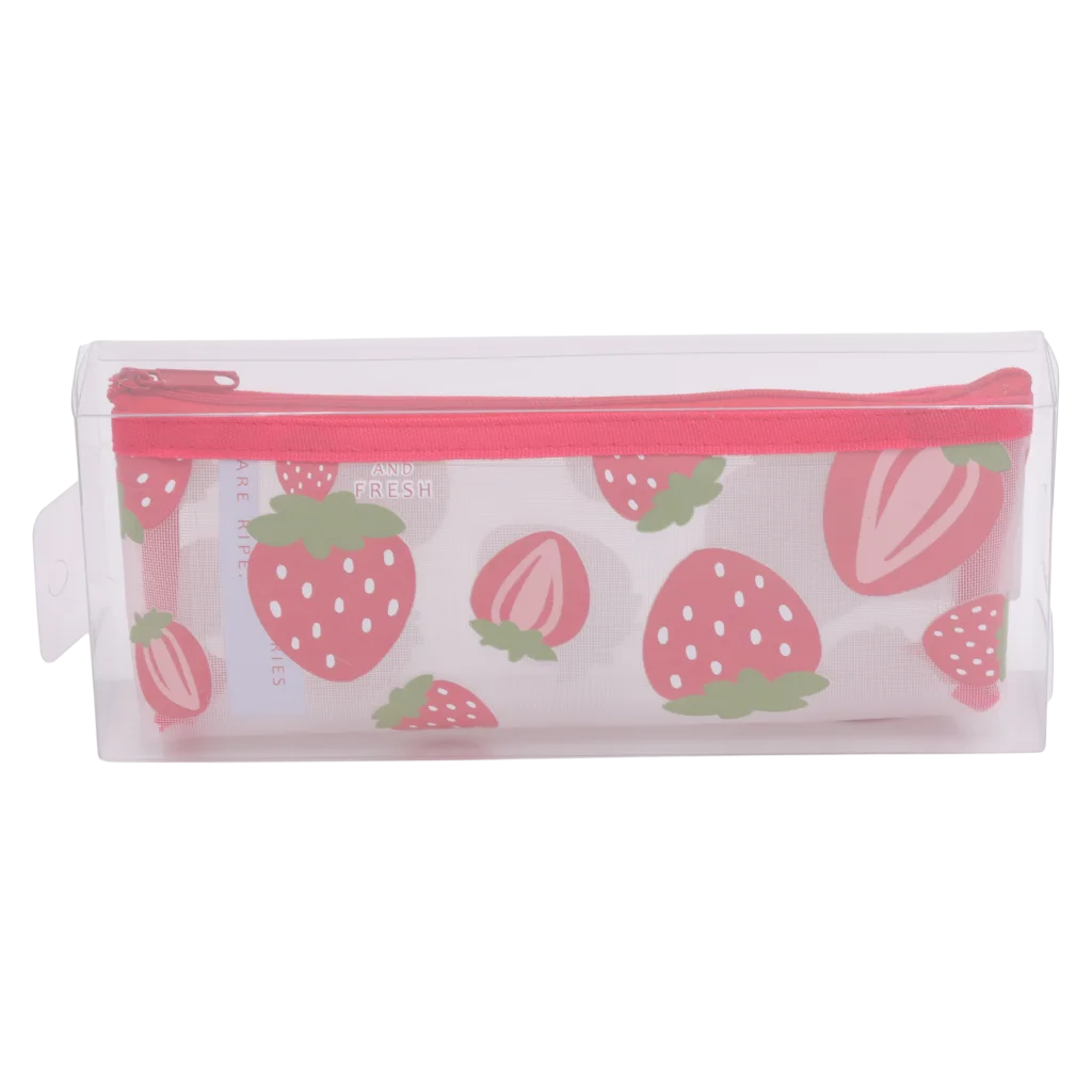 Das Mäppchen präsentiert sich in transparenter Optik mit rosa Akzenten und niedlichem Erdbeer-Print. Der stabile Reißverschluss sorgt für einen sicheren Verschluss, während das leichte Material das Mäppchen besonders praktisch und einfach zu transportieren macht.