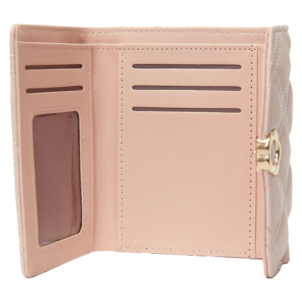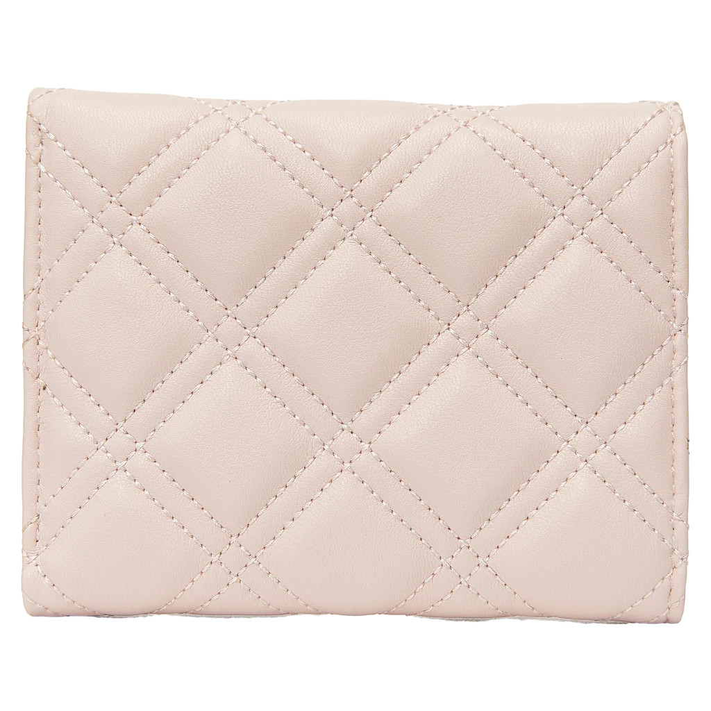 Gefertigt aus hochwertigem Kunstleder in zartem Beige, besticht die Geldbörse durch gesteppte Optik und einen stilvollen Blumenschließen-Print. Die abgerundete Form und das weiche Material machen sie angenehm in der Handhabung.