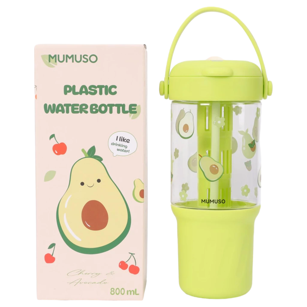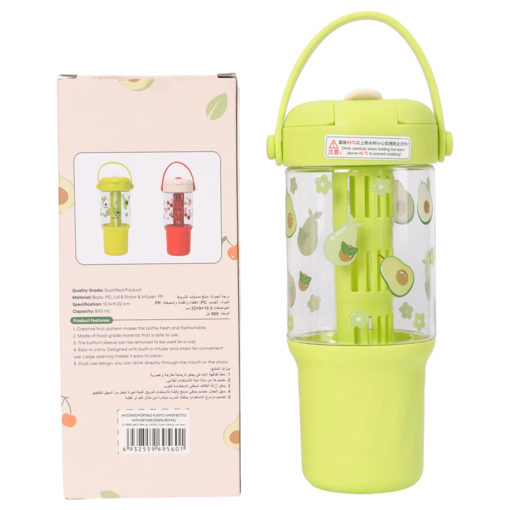 Diese Kunststoff-Wasserflasche mit Avocado-Design und 800 ml Fassungsvermögen ist praktisch für Schule, Büro oder unterwegs. Das leichte Material und der abnehmbare Trinkhalm machen sie ideal für Kinder und Erwachsene. Die Wasserflasche ist einfach zu reinigen und für kalte Getränke geeignet.