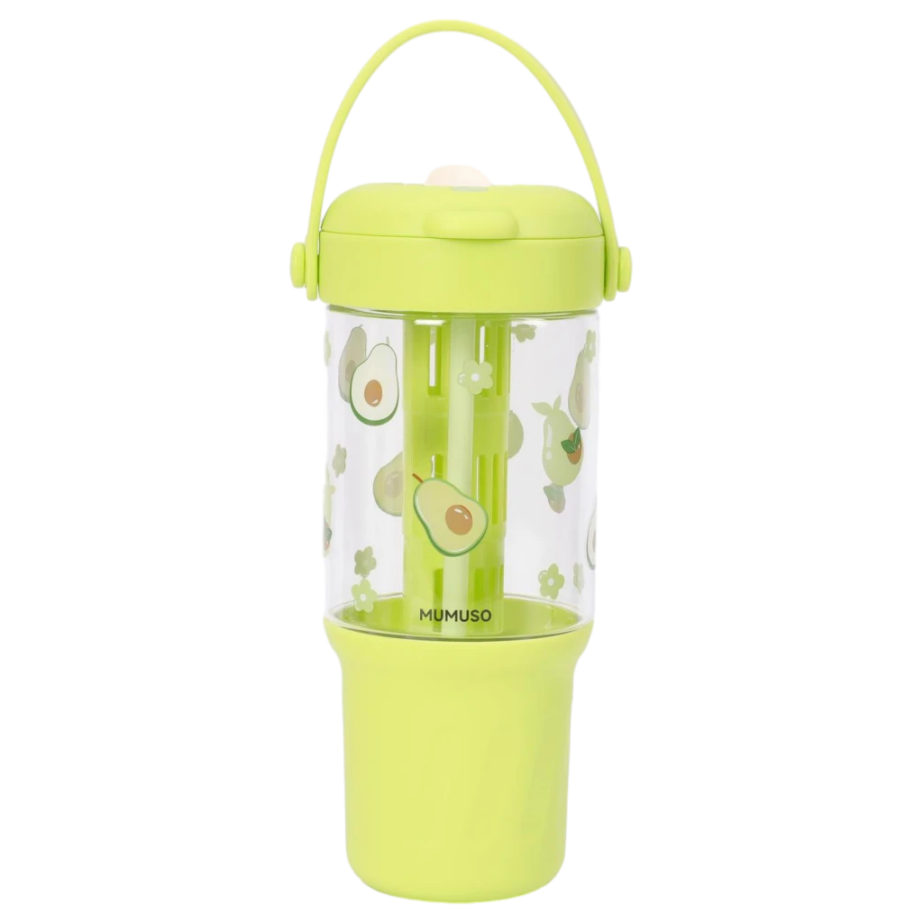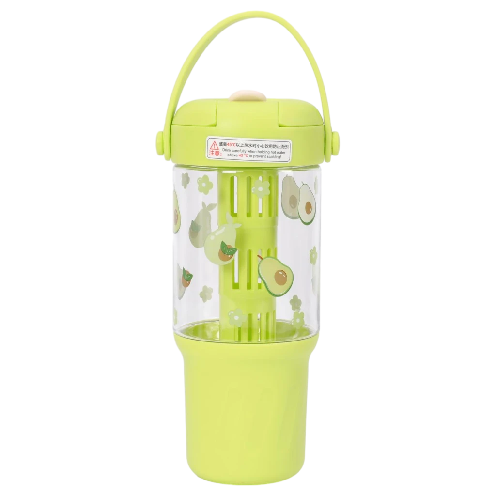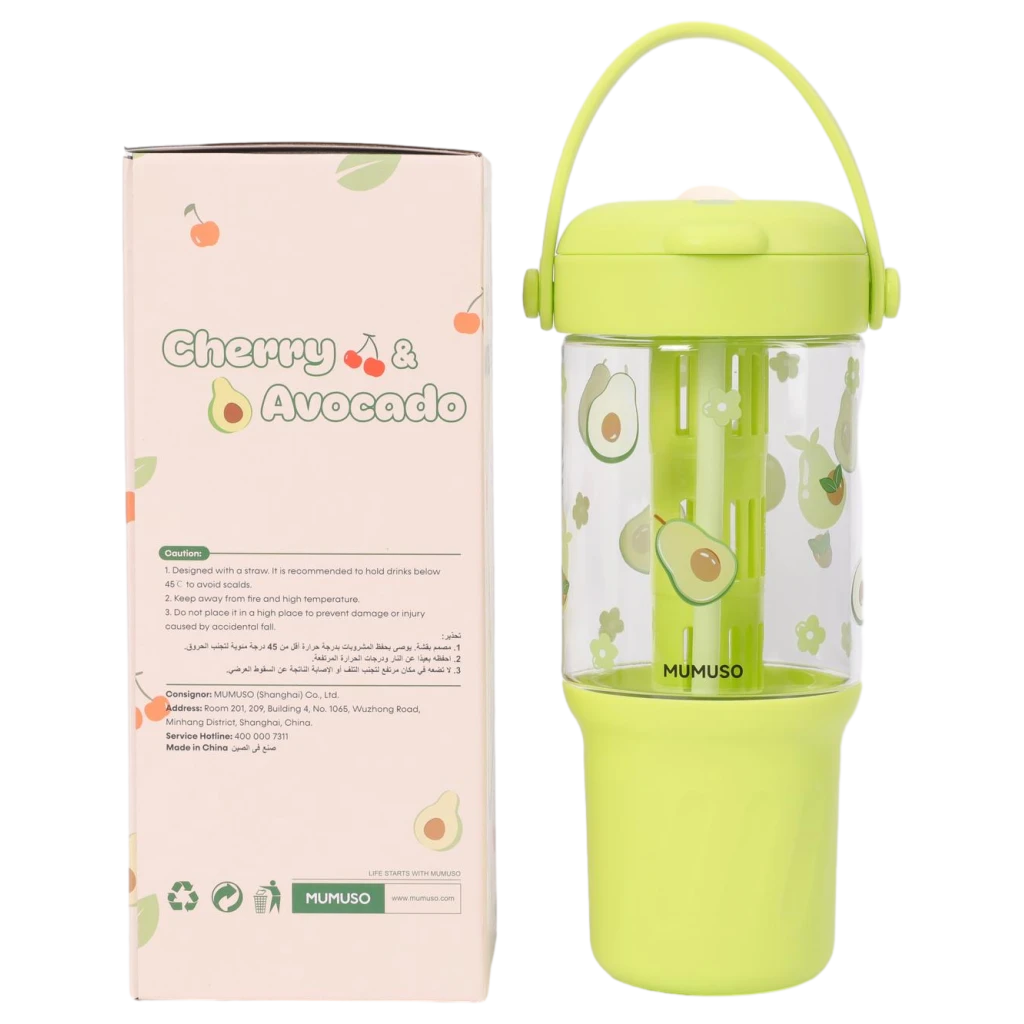 Gefertigt aus robustem Kunststoff (PP/AS), überzeugt die Flasche durch ihre Wiederverwendbarkeit und das farbenfrohe Design in Grün mit niedlichen Avocado-Prints. Der praktische Henkel und der integrierte Strohhalm sorgen für Komfort im täglichen Gebrauch.